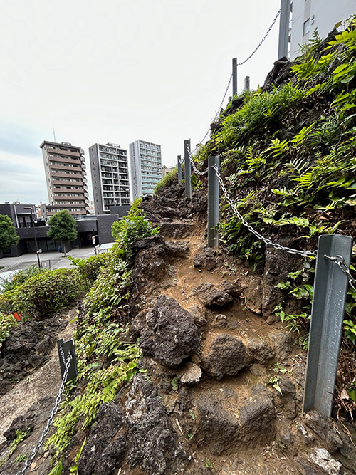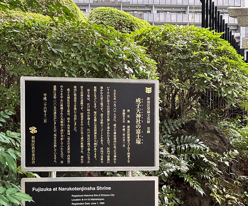 大正九年(一九二〇)八月に、成子天神社境内にあった天神山という小山に富士山の溶岩を配して築かれたもので、区内で最後に築かれた富士塚です。高さは約十二メートルあり、区内では最大規模となっています。塚の北側には浅山神社の小祠があります。