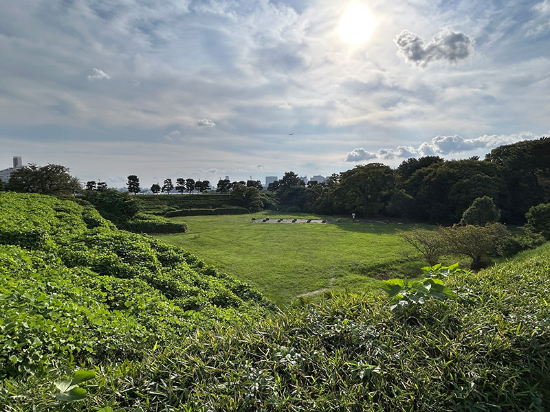石垣に囲まれて土手状になっており、真ん中が窪んでるんですよねー。