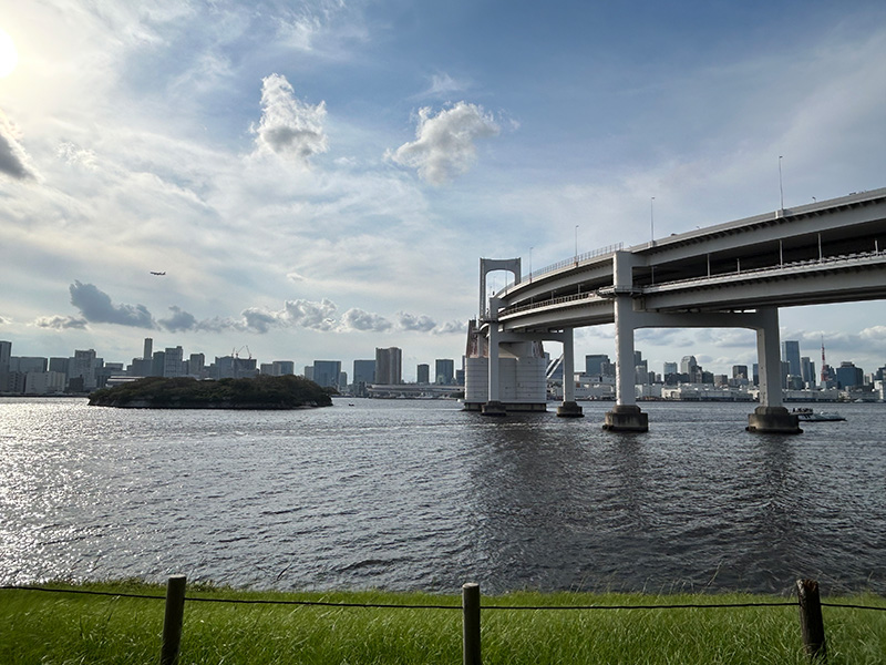 さあ、橋も終盤。フェンスから解放されて、台場公園を眺めながら下ってゆく。