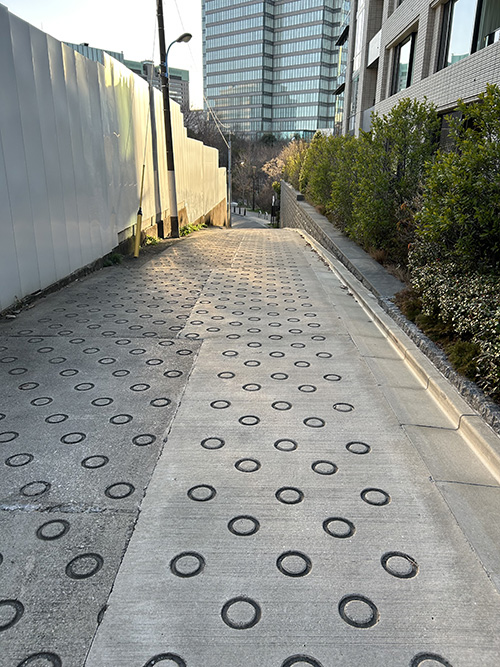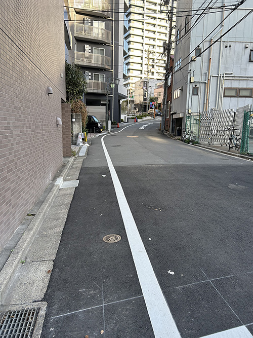 この先に鼠坂ってのがあって、気になったので見に行ったら本気の坂だった。(坂の本気度は、この路面の丸いやつがあるかどうかで決まるのだ)